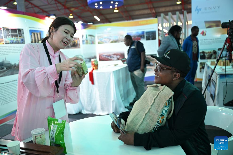 A Zimbabwean woman learns about Chinese tea at the Chinese pavilion at the Zimbabwe International Trade Fair in Bulawayo, Zimbabwe, on April 24, 2025. The Chinese pavilion is captivating visitors at the 65th edition of the Zimbabwe International Trade Fair (ZITF) underway in Bulawayo, Zimbabwe's second-largest city. (Xinhua/Xu Zheng)