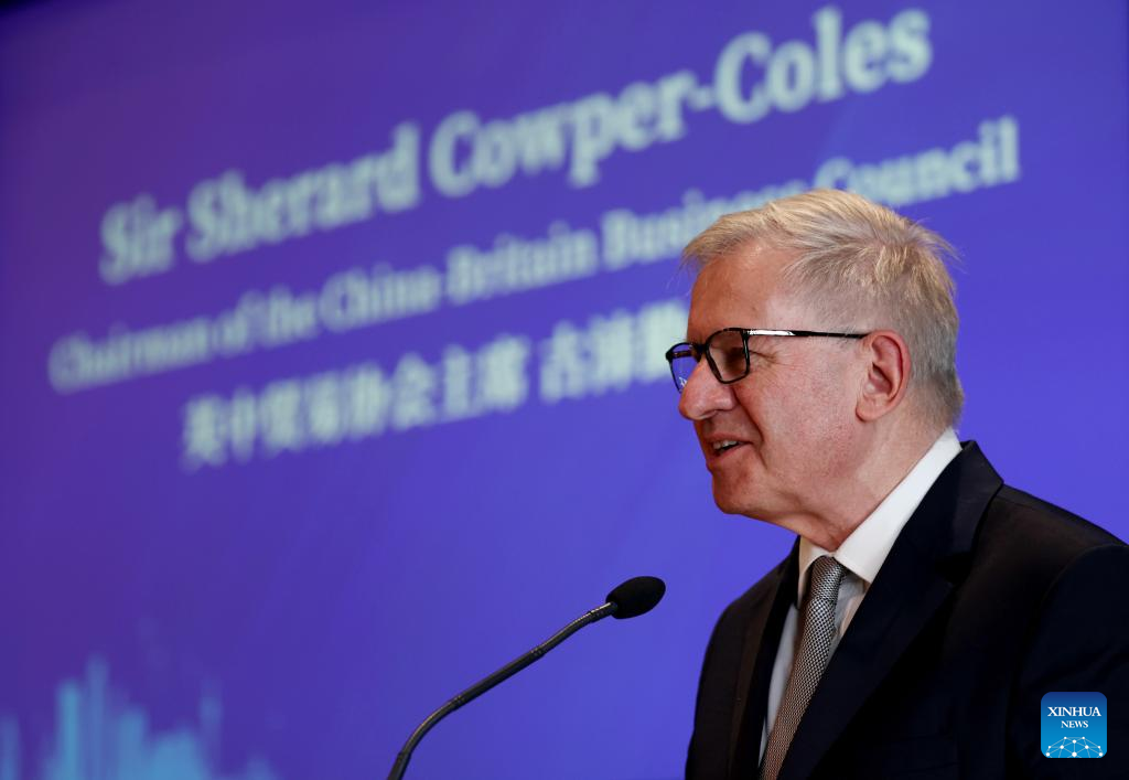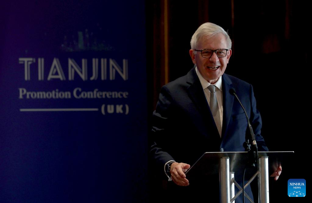 Sherard Cowper-Coles, chair of the China-Britain Business Council, delivers a speech at an investment and business promotion event for China's northern port city of Tianjin, held in London, Britain, on April 24, 2025. An investment and business promotion event for China's northern port city of Tianjin was held in central London on Thursday, with enthusiastic participation from both Chinese and British stakeholders. (Xinhua/Li Ying)