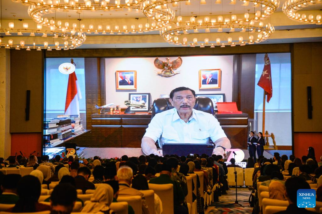 This photo taken on April 24, 2025 shows Luhut Binsar Pandjaitan, chairman of Indonesia's National Economic Council, delivering a speech through video at an international academic symposium titled "Seventy Years of Bandung Spirit: Strengthening Global South Development Amidst Global Challenges" in Bandung, Indonesia. The symposium was held here on Thursday to commemorate the 70th anniversary of the Bandung Conference. More than 400 government officials, diplomatic envoys, scholars and youth representatives from China, Indonesia, India, Pakistan and other countries and regions attended the meeting. (Xinhua/Xu Qin)