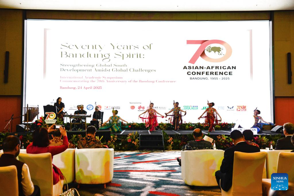 Dancers perform traditional West Javanese dance at an international academic symposium titled "Seventy Years of Bandung Spirit: Strengthening Global South Development Amidst Global Challenges" in Bandung, Indonesia, April 24, 2025. The symposium was held here on Thursday to commemorate the 70th anniversary of the Bandung Conference. More than 400 government officials, diplomatic envoys, scholars and youth representatives from China, Indonesia, India, Pakistan and other countries and regions attended the meeting. (Xinhua/Xu Qin)