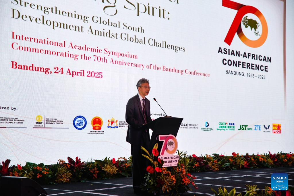 Chinese Ambassador to Indonesia Wang Lutong delivers a speech at an international academic symposium titled "Seventy Years of Bandung Spirit: Strengthening Global South Development Amidst Global Challenges" in Bandung, Indonesia, April 24, 2025. The symposium was held here on Thursday to commemorate the 70th anniversary of the Bandung Conference. More than 400 government officials, diplomatic envoys, scholars and youth representatives from China, Indonesia, India, Pakistan and other countries and regions attended the meeting. (Xinhua/Xu Qin)
