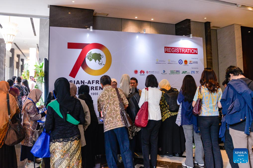 Participants register for an international academic symposium titled "Seventy Years of Bandung Spirit: Strengthening Global South Development Amidst Global Challenges" in Bandung, Indonesia, April 24, 2025. The symposium was held here on Thursday to commemorate the 70th anniversary of the Bandung Conference. More than 400 government officials, diplomatic envoys, scholars and youth representatives from China, Indonesia, India, Pakistan and other countries and regions attended the meeting. (Xinhua/Xu Qin)