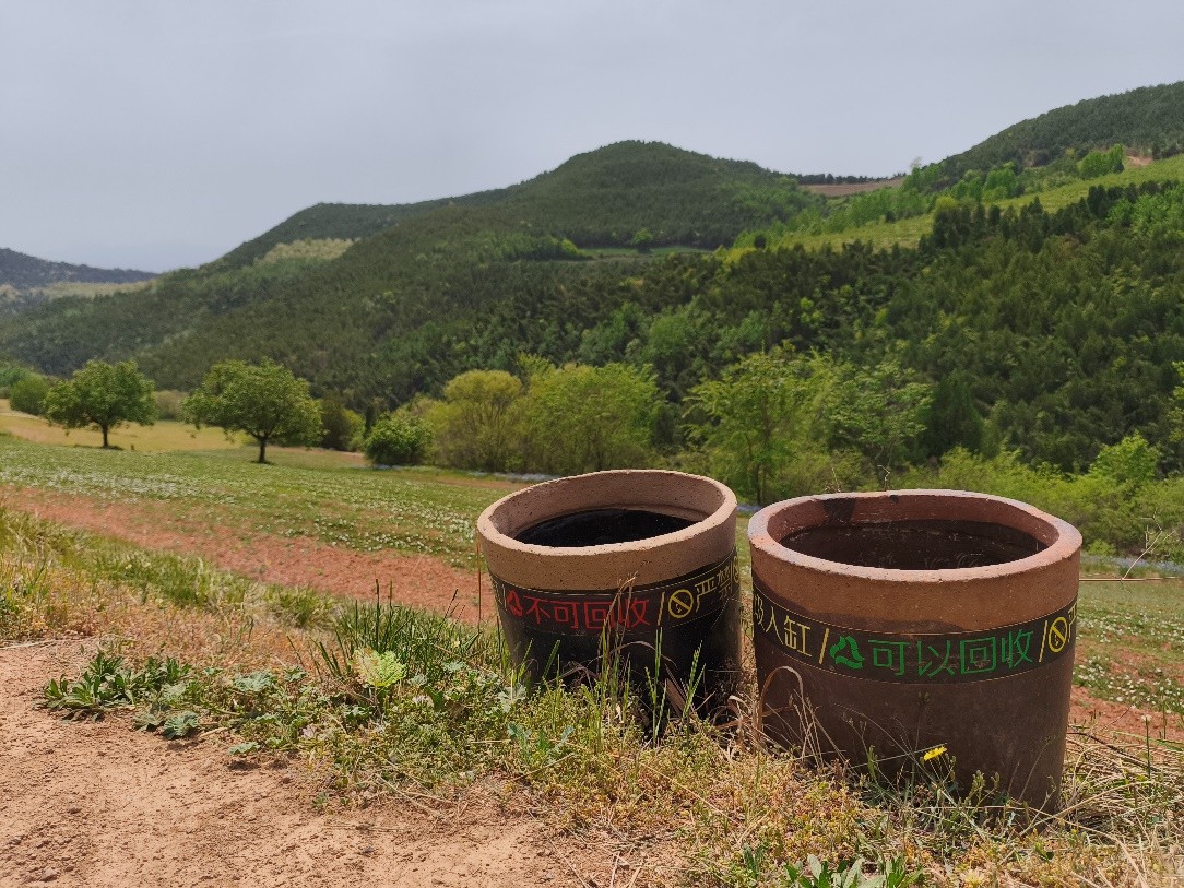 Photo shows waste bins made from pottery vats at Luoyang Sancai (International) Ceramic Village in Luoning county, Luoyang, central China's Henan Province. (People's Daily Online/Lu Yang)