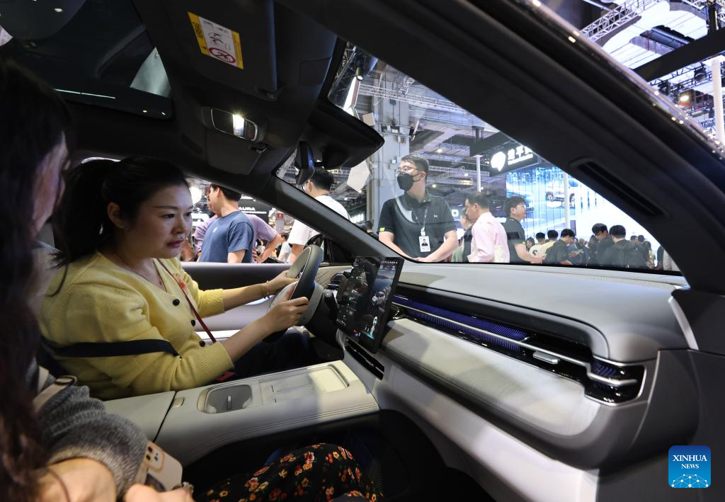Visitors sit in an Xpeng G6 on display at the 21st Shanghai International Automobile Industry Exhibition in east China's Shanghai, April 26, 2025. The exhibition, also known as Auto Shanghai 2025, not only foreshadows technological trends in the global auto market, but also demonstrates the strength and confidence of China's rising automakers in the face of established global giants. (Xinhua/Fang Zhe)