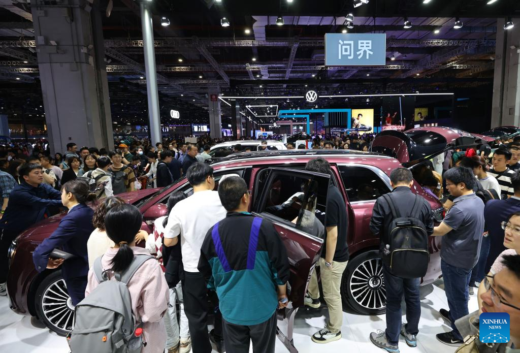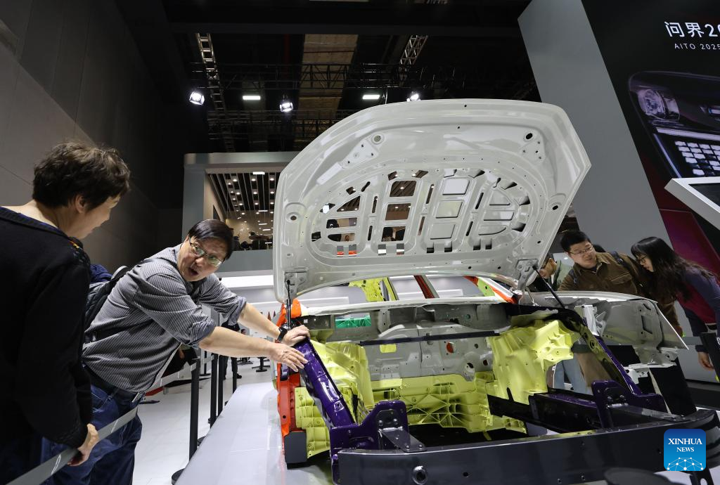Visitors view an exhibit of Chinese car brand AITO at the 21st Shanghai International Automobile Industry Exhibition in east China's Shanghai, April 26, 2025. The exhibition, also known as Auto Shanghai 2025, not only foreshadows technological trends in the global auto market, but also demonstrates the strength and confidence of China's rising automakers in the face of established global giants. (Xinhua/Fang Zhe)