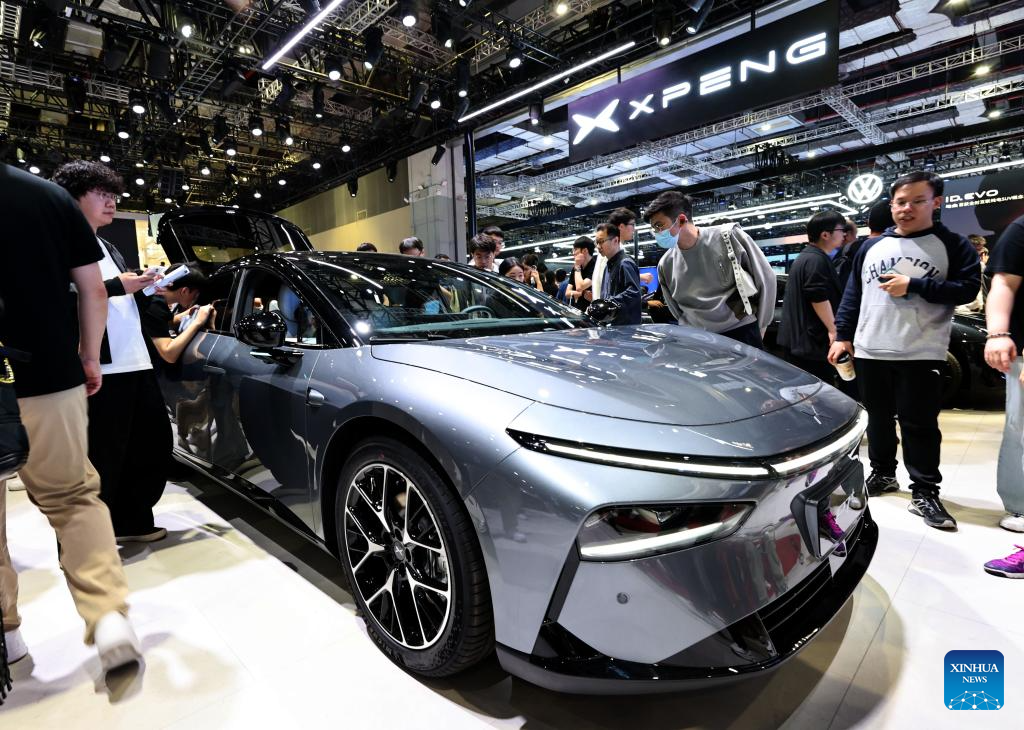 Visitors look at an Xpeng P7+ on display at the 21st Shanghai International Automobile Industry Exhibition in east China's Shanghai, April 26, 2025. The exhibition, also known as Auto Shanghai 2025, not only foreshadows technological trends in the global auto market, but also demonstrates the strength and confidence of China's rising automakers in the face of established global giants. (Xinhua/Fang Zhe)