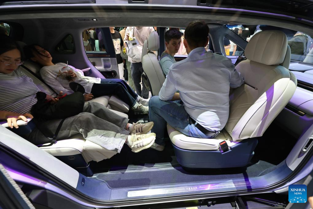 Visitors try a vehicle of Chinese car brand Zeekr at the 21st Shanghai International Automobile Industry Exhibition in east China's Shanghai, April 26, 2025. The exhibition, also known as Auto Shanghai 2025, not only foreshadows technological trends in the global auto market, but also demonstrates the strength and confidence of China's rising automakers in the face of established global giants. (Xinhua/Fang Zhe)