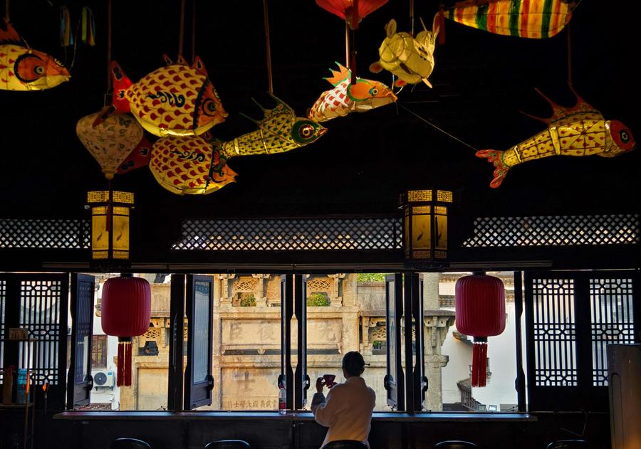 A tourist rests at a cafe in Huizhou ancient town, Shexian County, east China's Anhui Province, March 18, 2025. (Xinhua/Guo Chen)