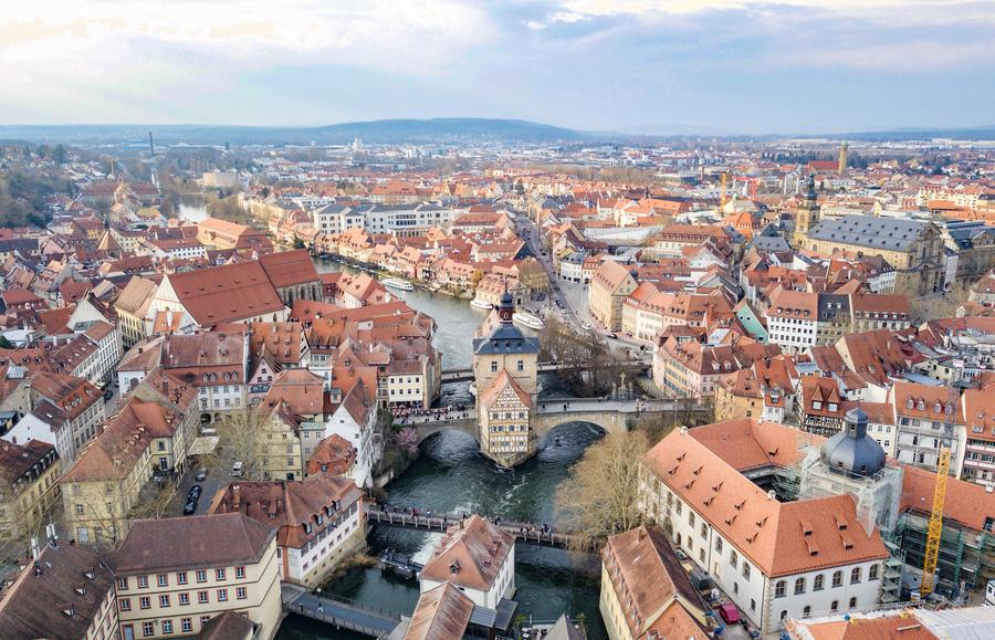 An aerial drone photo taken on March 24, 2025 shows the ancient town of Bamberg, in Bavarian state, Germany. (Xinhua/Ma Zhiyi)