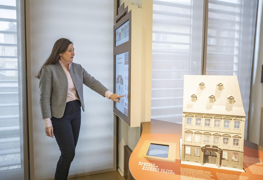 Simona von Eyb, director of the World Heritage Center Bamberg, introduces an interaction device at an exhibition hall of the center in the ancient town of Bamberg in Bavarian state, Germany, March 24, 2025. (Xinhua/Zhang Fan)