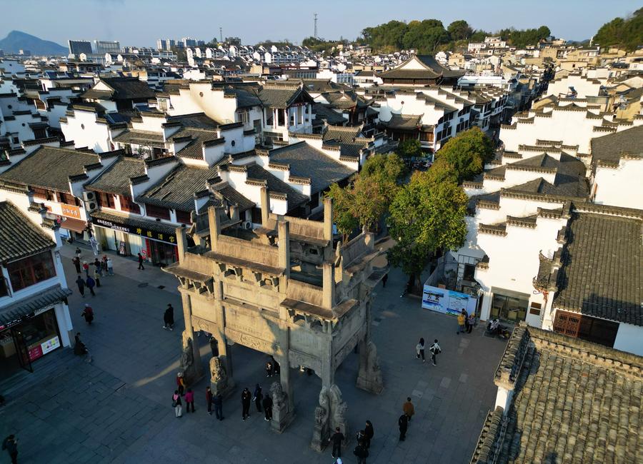 An aerial drone photo taken on March 19, 2025 shows Xuguo stone archway in Huizhou ancient town of Shexian County, east China's Anhui Province. (Xinhua/Guo Chen)