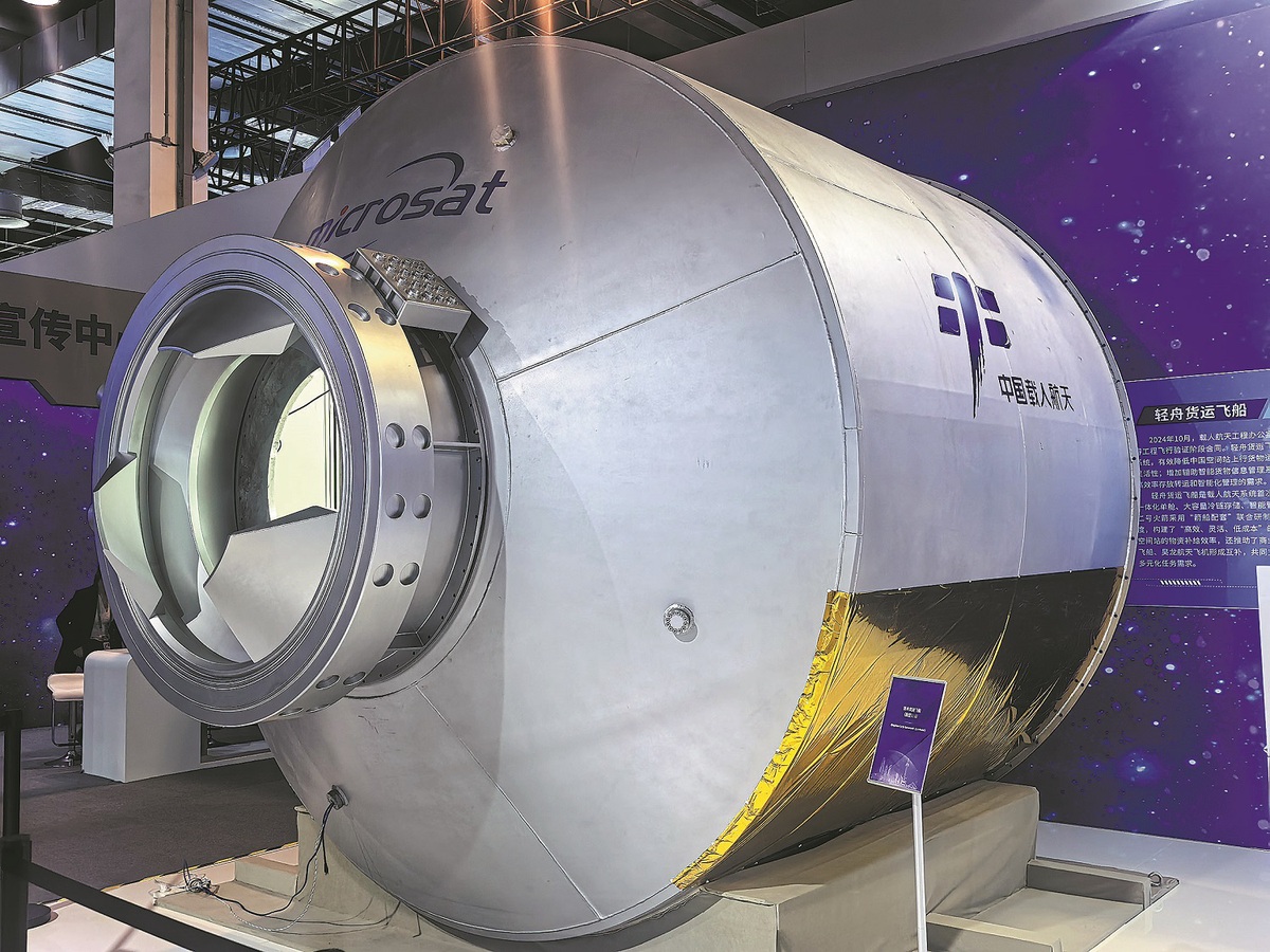 A life-size model of the Qingzhou cargo spacecraft at an aerospace science exhibition in Shanghai on Wednesday. ZHANG JIANSONG/XINHUA