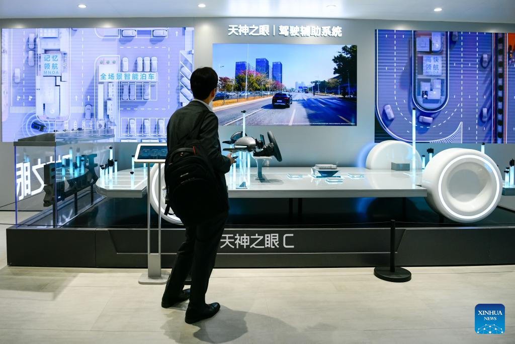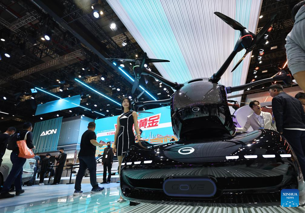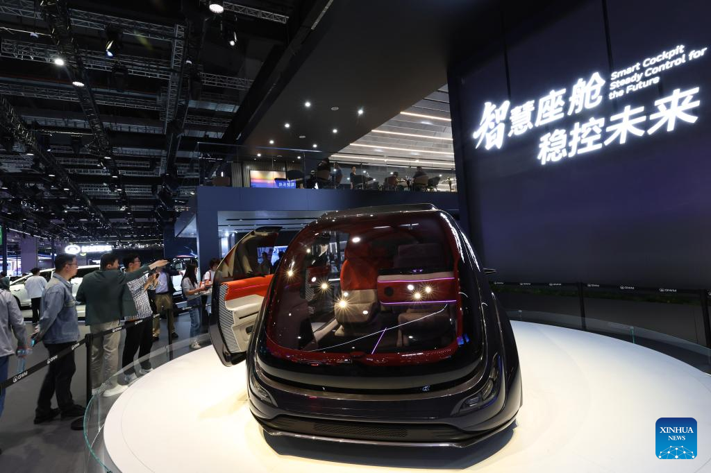 This photo taken on April 25, 2025 shows a vehicle displayed at the booth of GAC Group at the 21st Shanghai International Automobile Industry Exhibition in east China's Shanghai. Themed "Embracing Innovation, Empowering the Future," the exhibition, also known as Auto Shanghai 2025, kicked off here on Wednesday, attracting nearly 1,000 noted enterprises from 26 countries and regions. In addition to new models debuting, automakers also seized the stage with their latest intelligent vehicle technologies, including intelligent driving, artificial intelligence (AI) system, and smart cockpits. (Xinhua/Fang Zhe)