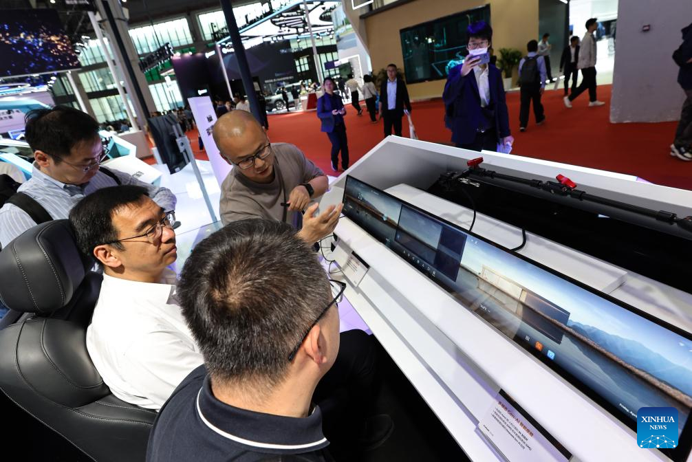 People view a Gen-AI smart cockpits system at the 21st Shanghai International Automobile Industry Exhibition in east China's Shanghai, April 25, 2025. Themed "Embracing Innovation, Empowering the Future," the exhibition, also known as Auto Shanghai 2025, kicked off here on Wednesday, attracting nearly 1,000 noted enterprises from 26 countries and regions. In addition to new models debuting, automakers also seized the stage with their latest intelligent vehicle technologies, including intelligent driving, artificial intelligence (AI) system, and smart cockpits. (Xinhua/Fang Zhe)