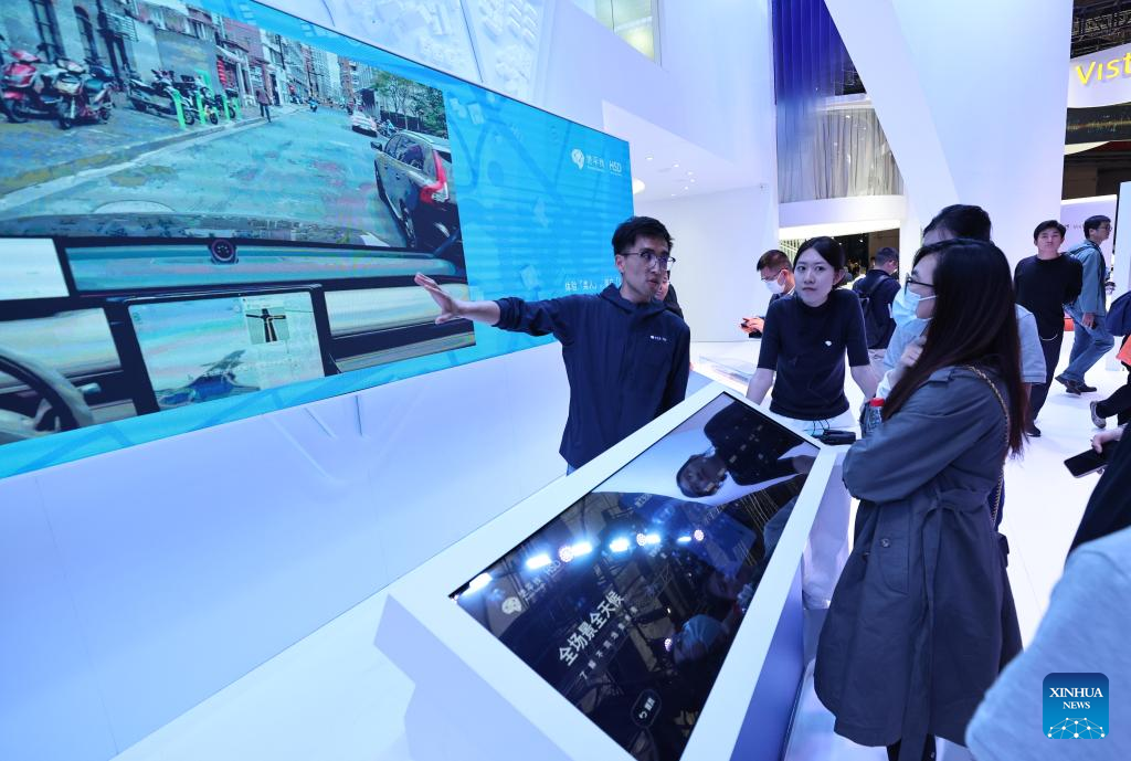 A staff member (1st L) of Horizon Robotics displays a driver assistance system at the 21st Shanghai International Automobile Industry Exhibition in east China's Shanghai, April 25, 2025. Themed "Embracing Innovation, Empowering the Future," the exhibition, also known as Auto Shanghai 2025, kicked off here on Wednesday, attracting nearly 1,000 noted enterprises from 26 countries and regions. In addition to new models debuting, automakers also seized the stage with their latest intelligent vehicle technologies, including intelligent driving, artificial intelligence (AI) system, and smart cockpits. (Xinhua/Fang Zhe)