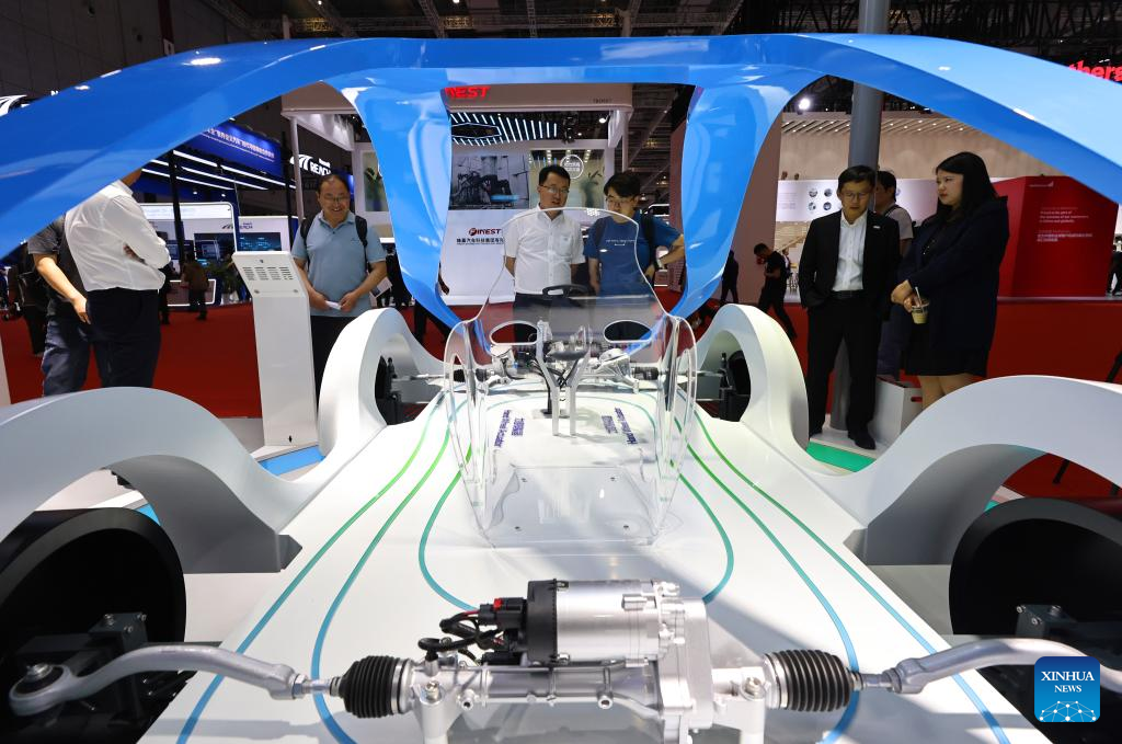 People view a steer-by-wire system module at the 21st Shanghai International Automobile Industry Exhibition in east China's Shanghai, April 25, 2025. Themed "Embracing Innovation, Empowering the Future," the exhibition, also known as Auto Shanghai 2025, kicked off here on Wednesday, attracting nearly 1,000 noted enterprises from 26 countries and regions. In addition to new models debuting, automakers also seized the stage with their latest intelligent vehicle technologies, including intelligent driving, artificial intelligence (AI) system, and smart cockpits. (Xinhua/Fang Zhe)