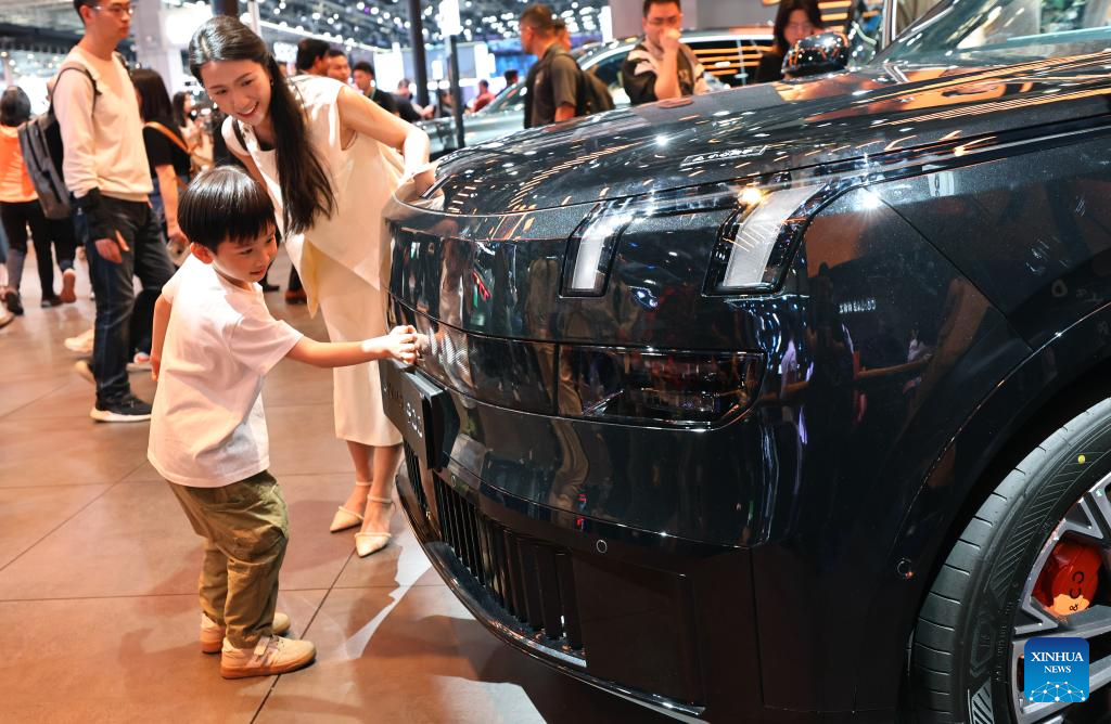 A child interacts with a cat pattern on a Lynk & Co car at the 21st Shanghai International Automobile Industry Exhibition in east China's Shanghai, April 25, 2025. Themed "Embracing Innovation, Empowering the Future," the exhibition, also known as Auto Shanghai 2025, kicked off here on Wednesday, attracting nearly 1,000 noted enterprises from 26 countries and regions. In addition to new models debuting, automakers also seized the stage with their latest intelligent vehicle technologies, including intelligent driving, artificial intelligence (AI) system, and smart cockpits. (Xinhua/Fang Zhe)