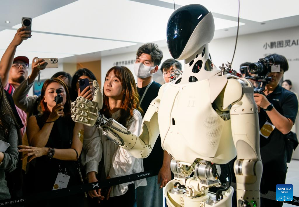 This photo taken on April 25, 2025 shows robot IRON of Xiaopeng at the 21st Shanghai International Automobile Industry Exhibition in east China's Shanghai. Themed "Embracing Innovation, Empowering the Future," the exhibition, also known as Auto Shanghai 2025, kicked off here on Wednesday, attracting nearly 1,000 noted enterprises from 26 countries and regions. In addition to new models debuting, automakers also seized the stage with their latest intelligent vehicle technologies, including intelligent driving, artificial intelligence (AI) system, and smart cockpits. (Xinhua/Wang Xiang)