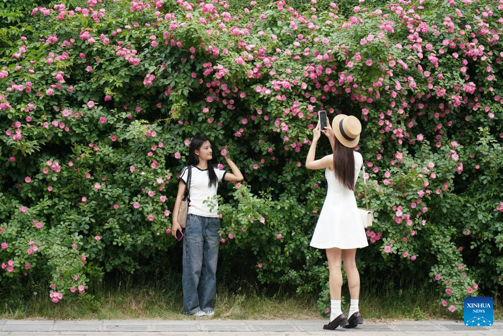 People take photos with blossoms at a park in Xi'an, northwest China's Shaanxi Province, April 25, 2025. (Xinhua/Shao Rui)