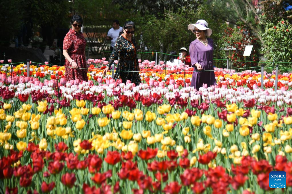 People enjoy tulips at Xi'an Botanical Garden in Xi'an, northwest China's Shaanxi Province, April 10, 2025. (Xinhua/Zhang Bowen)
