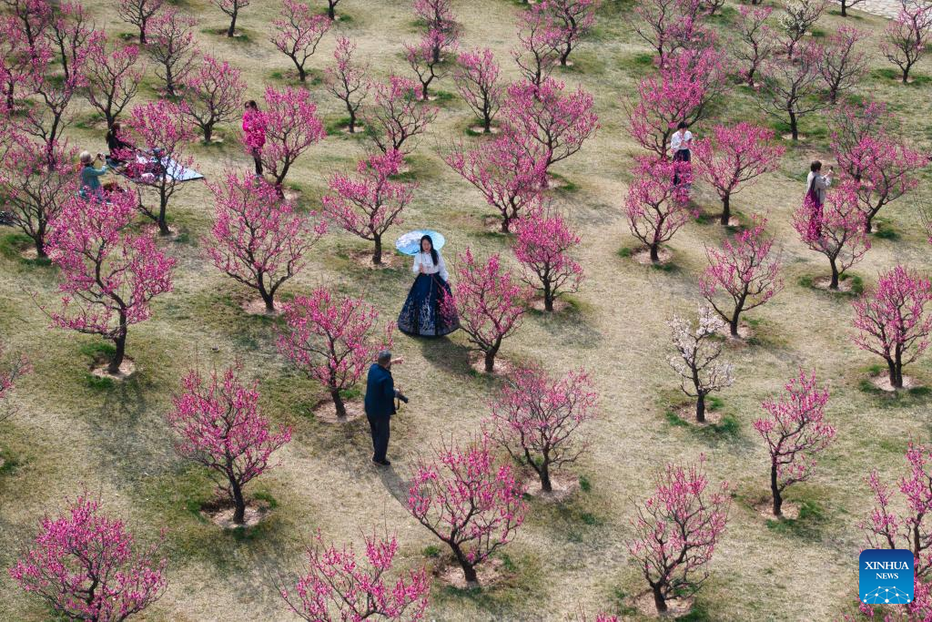 An aerial drone photo taken on March 13, 2025 shows people enjoying plum flowers in Chang'an District of Xi'an, northwest China's Shaanxi Province. (Xinhua/Shao Rui)