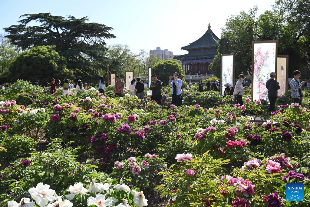 People enjoy flowers at a park in Xi'an, northwest China's Shaanxi Province, April 14, 2025. (Xinhua/Zou Jingyi)