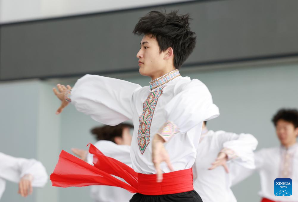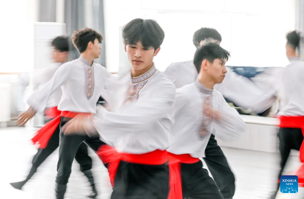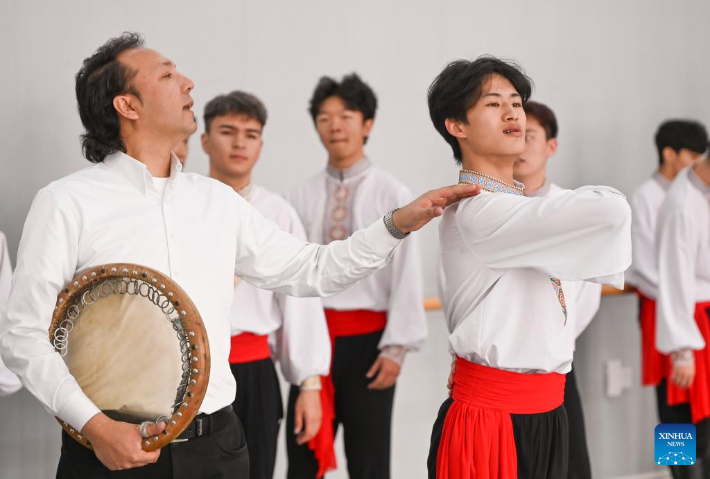 Luo Hao (2nd R) practices Uygur dance at the Dance Academy of Xinjiang Arts University in Urumqi, northwest China's Xinjiang Uygur Autonomous Region, April 14, 2025. (Xinhua/Wang Fei)