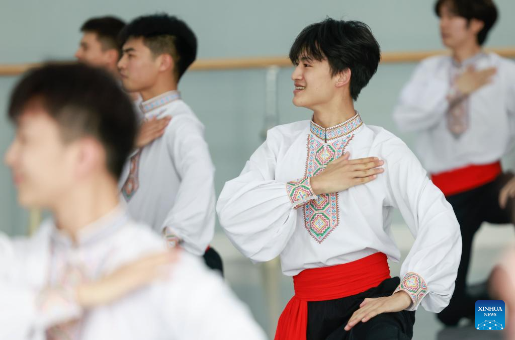 Luo Hao (front) practices Uygur dance at the Dance Academy of Xinjiang Arts University in Urumqi, northwest China's Xinjiang Uygur Autonomous Region, April 14, 2025. (Photo by Xu Rui/Xinhua)