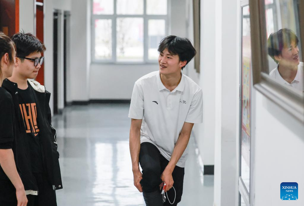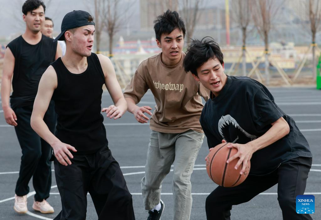 Luo Hao (1st R) plays basketball with friends at Xinjiang Arts University in Urumqi, northwest China's Xinjiang Uygur Autonomous Region, April 18, 2025. (Xinhua/Wang Fei)