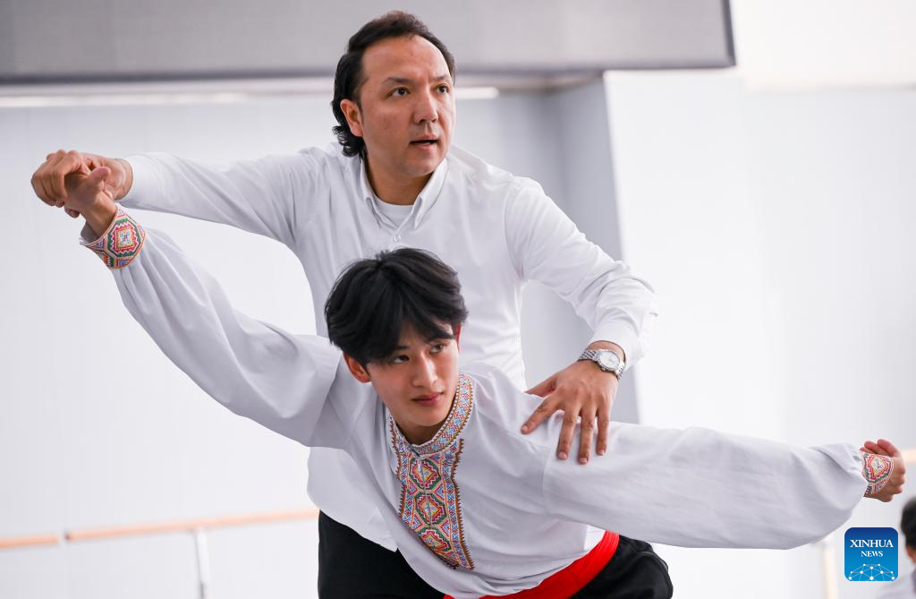 Luo Hao (L) practices dance "Makit Under the Sun" at the Dance Academy of Xinjiang Arts University in Urumqi, northwest China's Xinjiang Uygur Autonomous Region, April 14, 2025. (Xinhua/Wang Fei)