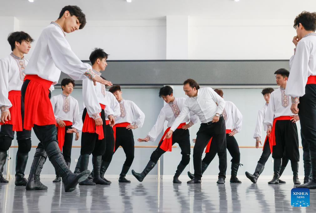 Luo Hao (1st R) practices Uygur dance at the Dance Academy of Xinjiang Arts University in Urumqi, northwest China's Xinjiang Uygur Autonomous Region, April 14, 2025. (Xinhua/Wang Fei)