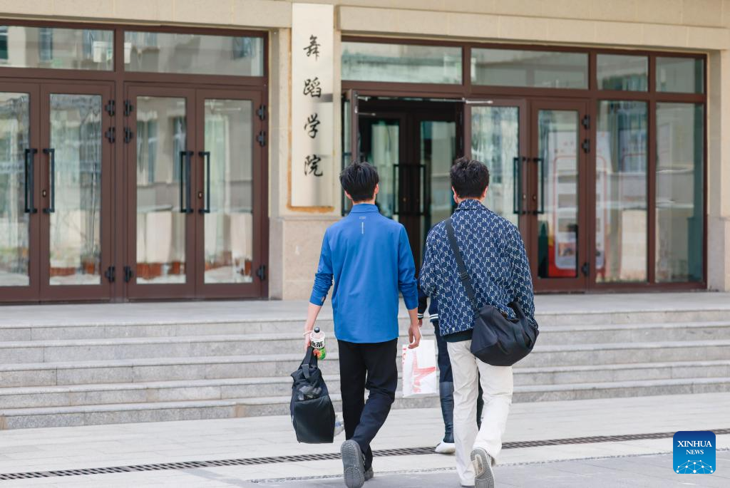 Luo Hao (L) and his classmate head for the Dance Academy of Xinjiang Arts University in Urumqi, northwest China's Xinjiang Uygur Autonomous Region, April 14, 2025. (Xinhua/Wang Fei)