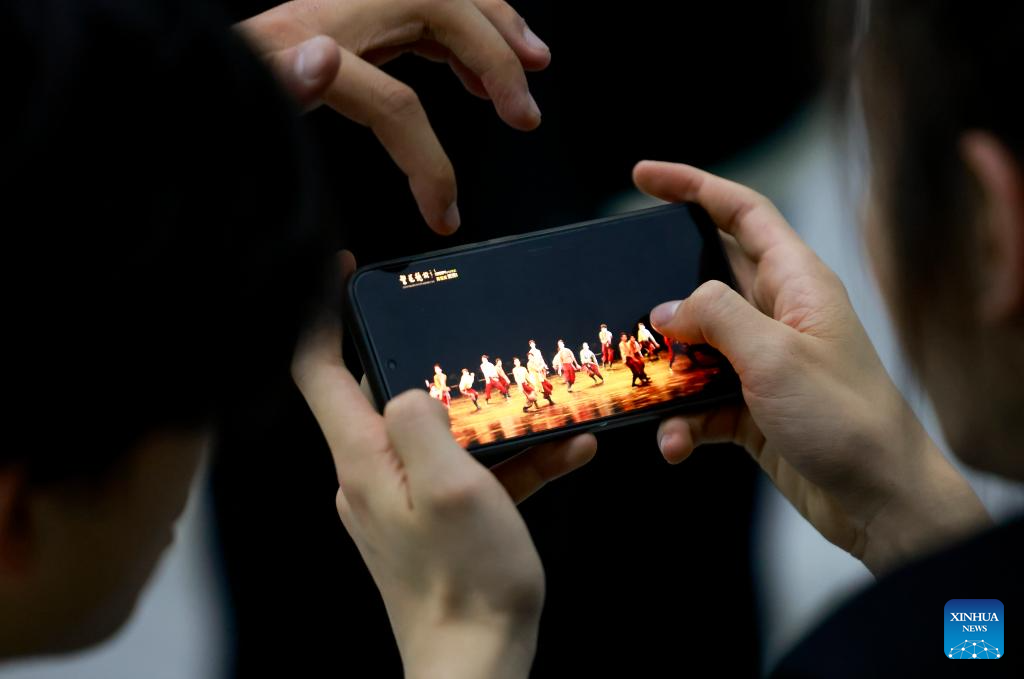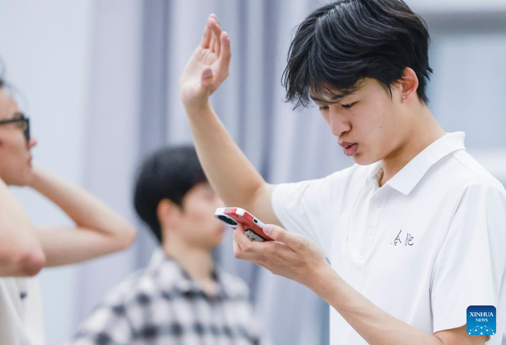Luo Hao watches a video to correct his movements during a break of rehearsal at the Dance Academy of Xinjiang Arts University in Urumqi, northwest China's Xinjiang Uygur Autonomous Region, April 14, 2025. (Xinhua/Wang Fei)