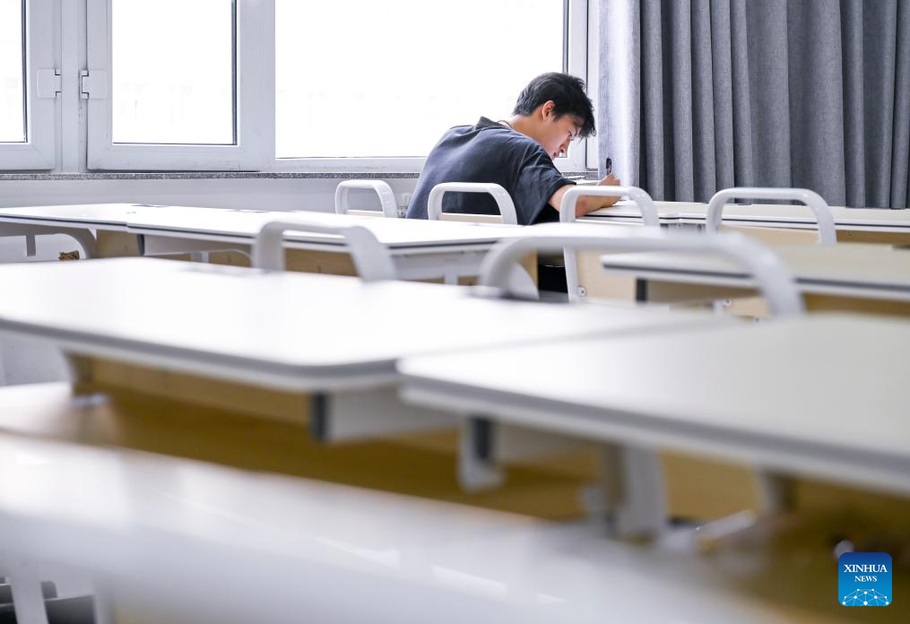 Luo Hao does homework at the Dance Academy of Xinjiang Arts University in Urumqi, northwest China's Xinjiang Uygur Autonomous Region, April 18, 2025. (Photo by Xu Rui/Xinhua)