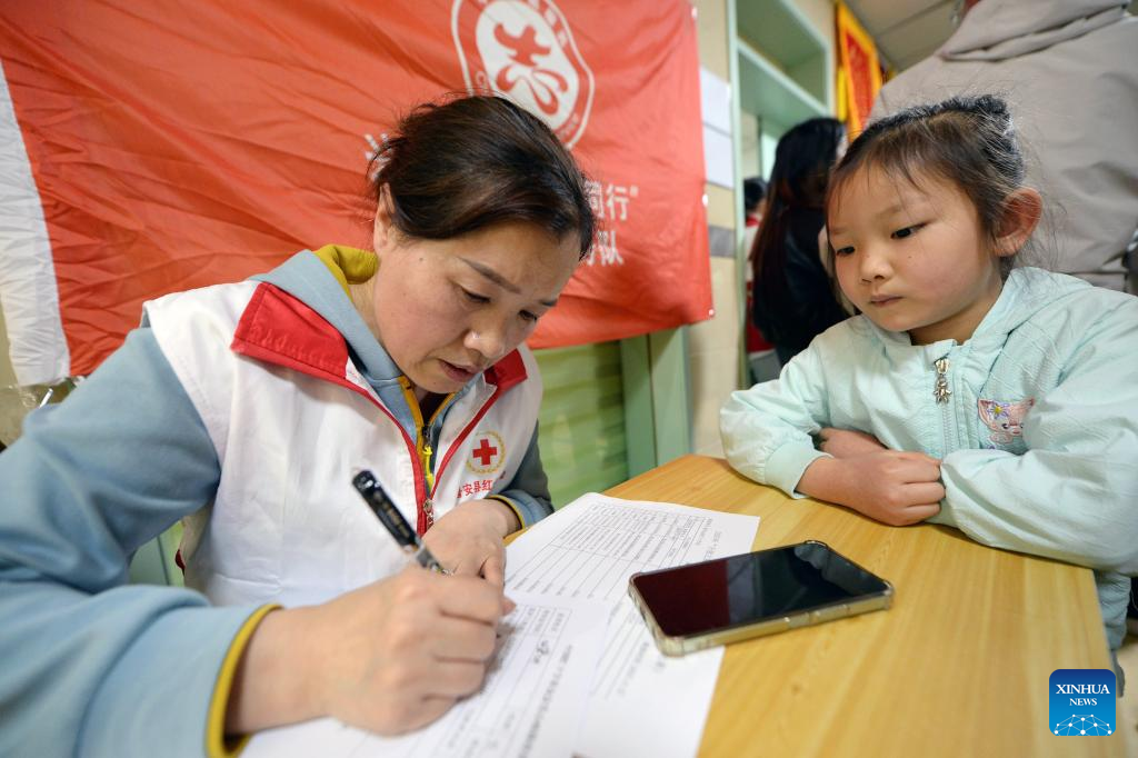 A Red Cross volunteer (L) registers information at a hospital in Bouyei-Miao Autonomous Prefecture of Qianxinan, southwest China's Guizhou Province, April 24, 2025. Recently, a congenital heart disease (CHD) screening program has been carried out in Guizhou Province. Children who are screened in accordance with surgical indications can receive free surgical treatment.