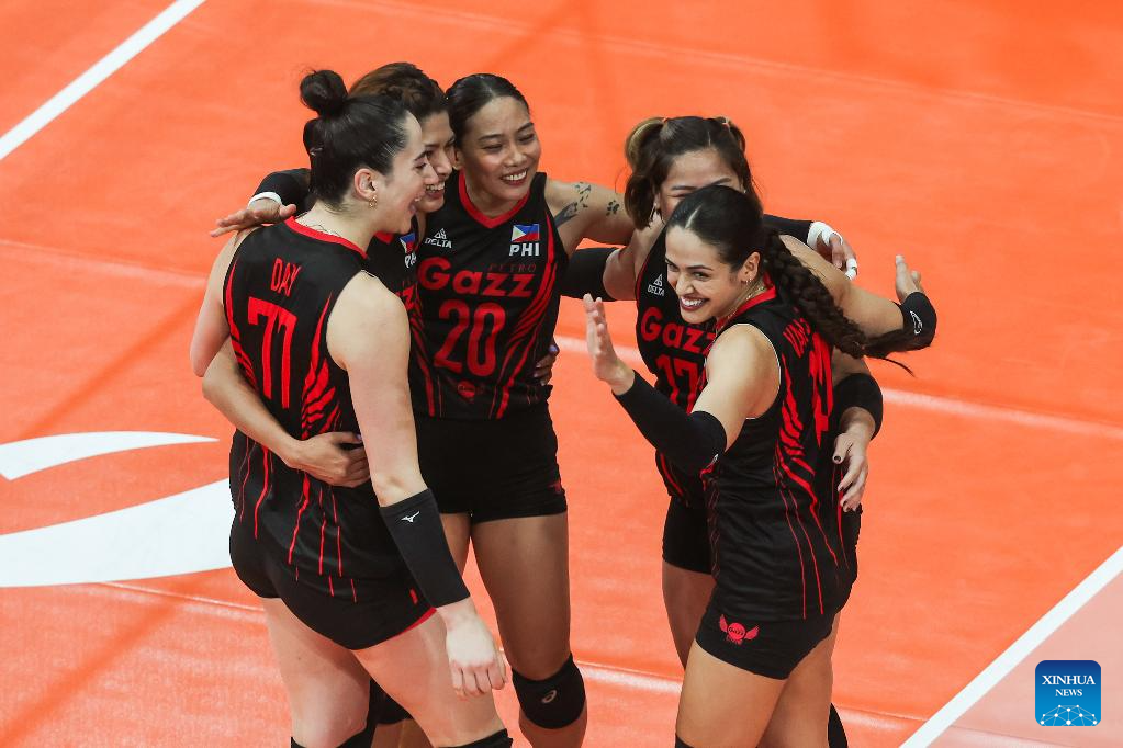 Players from the Philippines' Petro Gazz Angels celebrate after scoring a point during the quarterfinal match between China's BAIC Motor Volleyball Club and the Philippines' Petro Gazz Angels at the AVC Women's Volleyball Champions League in Pasig City, the Philippines, April 25, 2025. (Photo by ROUELLE UMALI/Xinhua)