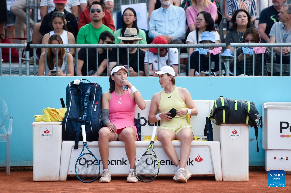 Zheng Saisai/Wang Xinyu (L) take a break during the women's doubles round of 32 match between Zheng Saisai/Wang Xinyu of China and Beatriz Haddad Maia of Brazil/Laura Siegemund of Germany at the Madrid Open tennis tournament in Madrid, Spain, April 25, 2025. (Photo by Gustavo Valiente/Xinhua)