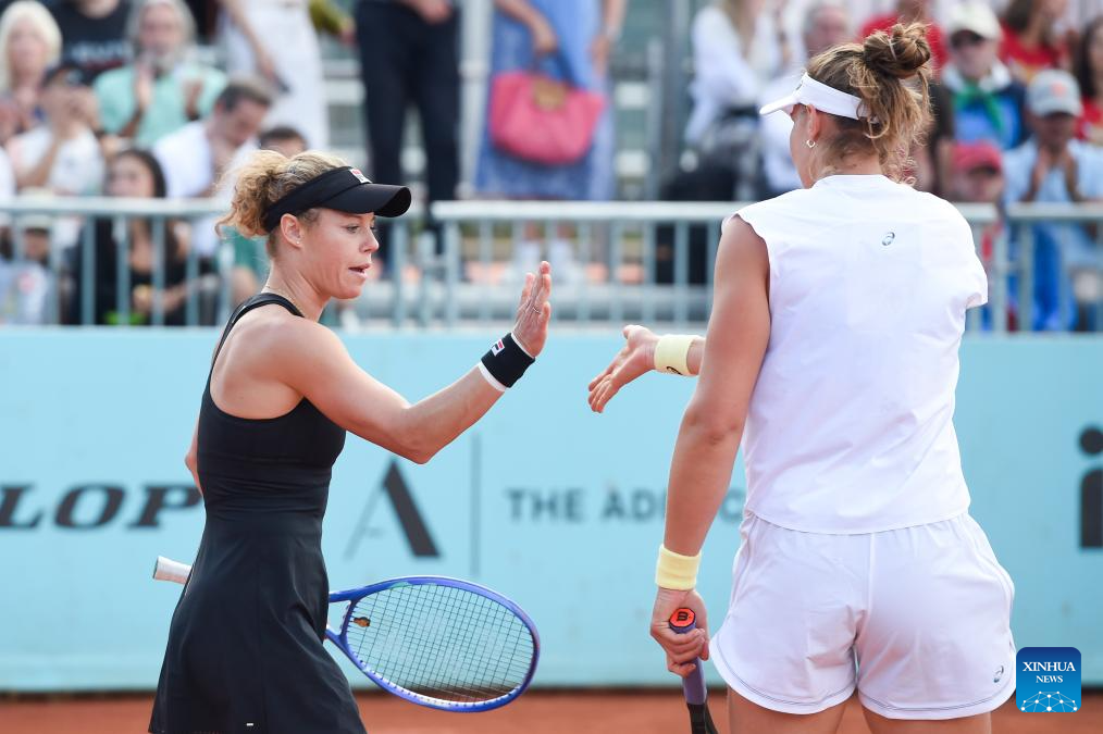 Beatriz Haddad Maia/Laura Siegemund (L) react during the women's doubles round of 32 match between Zheng Saisai/Wang Xinyu of China and Beatriz Haddad Maia of Brazil/Laura Siegemund of Germany at the Madrid Open tennis tournament in Madrid, Spain, April 25, 2025. (Photo by Gustavo Valiente/Xinhua)