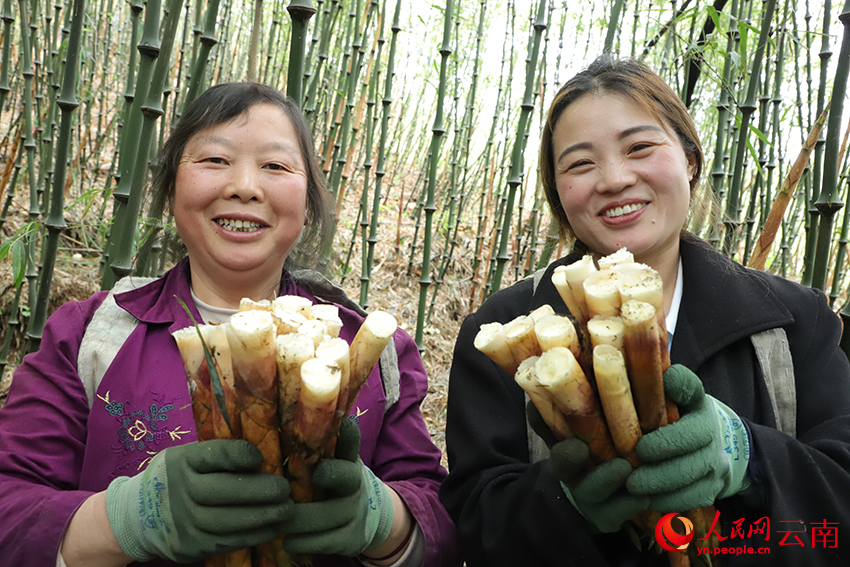 Farmers smile as they display freshly harvested bamboo shoots in Daguan county, Zhaotong city, southwest China's Yunnan Province. (Photo/Hu Shengyu)