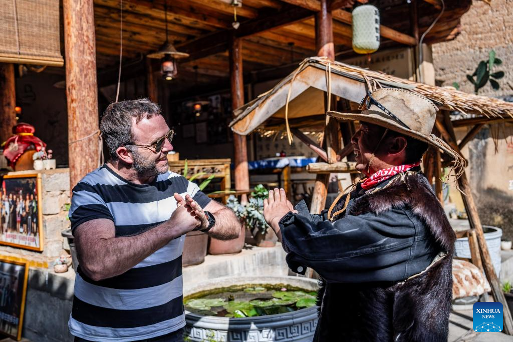 Yang Siyun (R), a descendant of local horse train operators, bids farewell to a foreign tourist at Sideng Village of Shaxi Town, Jianchuan County, southwest China's Yunnan Province, April 19, 2025. A remote town in Jianchuan County, Shaxi was once an important trading hub for tea, herbs, silks and salt on the ancient Tea Horse Road, a trade route dating back to the Tang Dynasty (618-907). (Xinhua/Hu Chao)