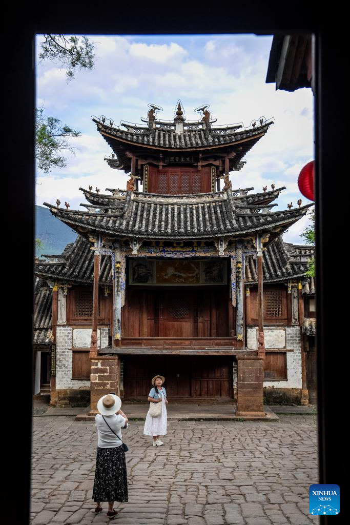 People visit an ancient stage at Sideng Village of Shaxi Town, Jianchuan County, southwest China's Yunnan Province, April 21, 2025. A remote town in Jianchuan County, Shaxi was once an important trading hub for tea, herbs, silks and salt on the ancient Tea Horse Road, a trade route dating back to the Tang Dynasty (618-907). (Xinhua/Hu Chao)