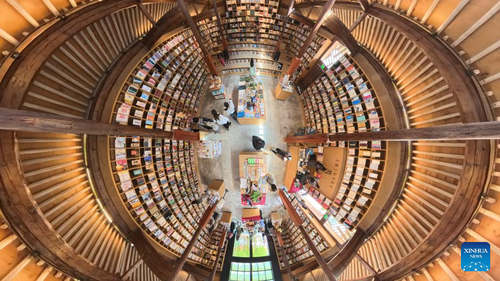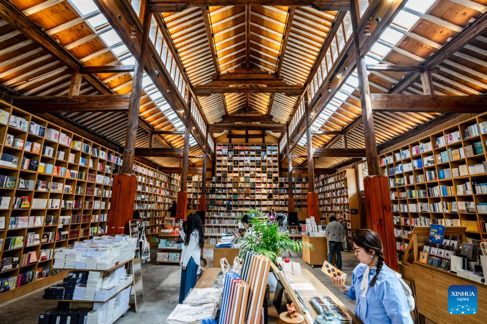People visit a bookshop at Beilong Village of Shaxi Town, Jianchuan County, southwest China's Yunnan Province, April 20, 2025. A remote town in Jianchuan County, Shaxi was once an important trading hub for tea, herbs, silks and salt on the ancient Tea Horse Road, a trade route dating back to the Tang Dynasty (618-907). (Xinhua/Liu Lianfen)
