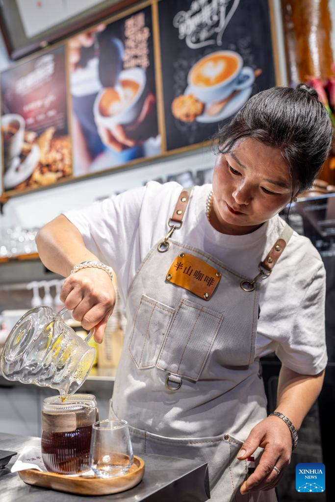 A villager brews coffee at Hualong Village of Shaxi Town, Jianchuan County, southwest China's Yunnan Province, April 20, 2025. A remote town in Jianchuan County, Shaxi was once an important trading hub for tea, herbs, silks and salt on the ancient Tea Horse Road, a trade route dating back to the Tang Dynasty (618-907). (Xinhua/Hu Chao)
