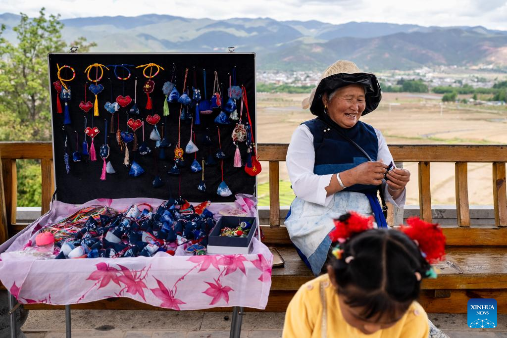 An elderly woman of Bai ethnic group arranges embroidered sachets at Hualong Village of Shaxi Town, Jianchuan County, southwest China's Yunnan Province, April 20, 2025. A remote town in Jianchuan County, Shaxi was once an important trading hub for tea, herbs, silks and salt on the ancient Tea Horse Road, a trade route dating back to the Tang Dynasty (618-907). (Xinhua/Liu Lianfen)