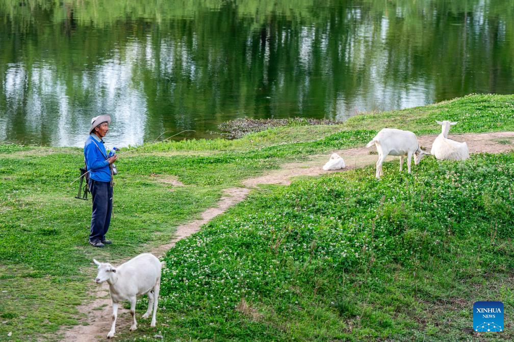 A villager herds sheep by a river in Beilong Village of Shaxi Town, Jianchuan County, southwest China's Yunnan Province, April 18, 2025. A remote town in Jianchuan County, Shaxi was once an important trading hub for tea, herbs, silks and salt on the ancient Tea Horse Road, a trade route dating back to the Tang Dynasty (618-907). (Xinhua/Hu Chao)