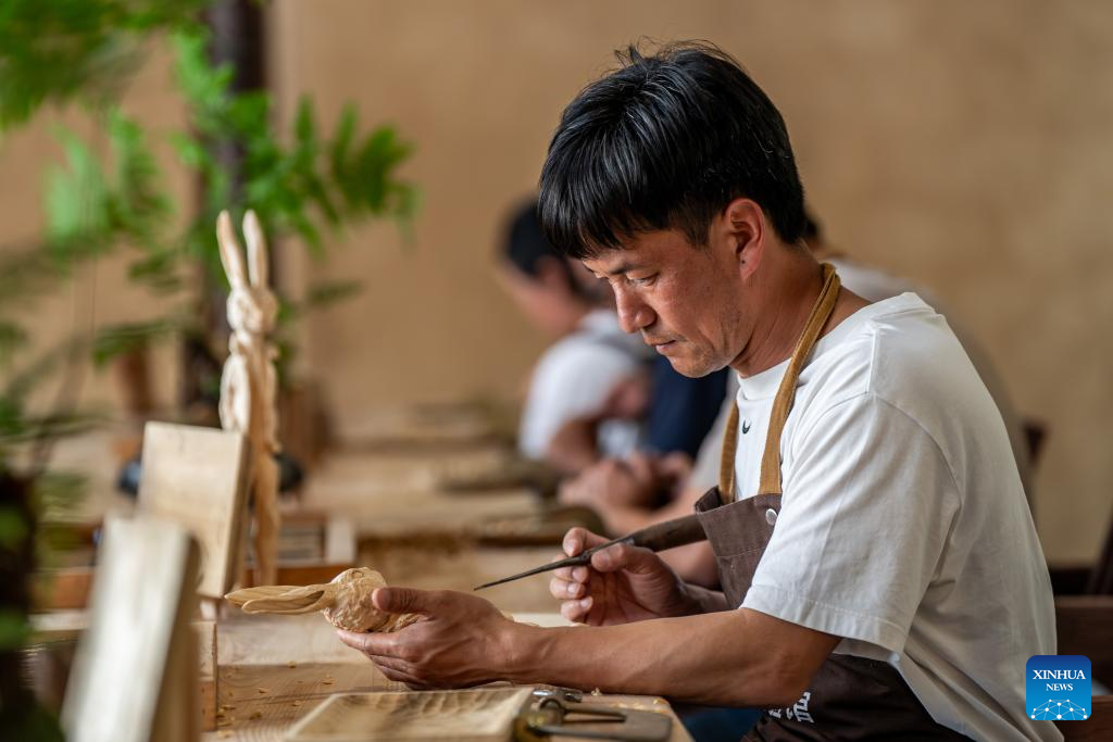 Shi Shunhua, a craftsman of Jianchuan woodcarving, works on a piece of artifact at Sideng Village of Shaxi Town, Jianchuan County, southwest China's Yunnan Province, April 19, 2025. A remote town in Jianchuan County, Shaxi was once an important trading hub for tea, herbs, silks and salt on the ancient Tea Horse Road, a trade route dating back to the Tang Dynasty (618-907). (Xinhua/Hu Chao)