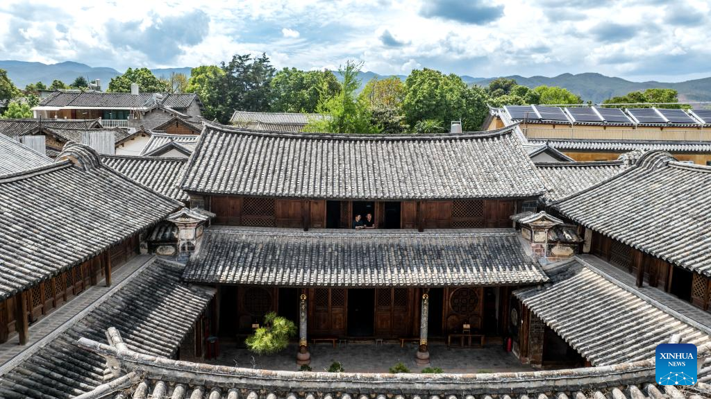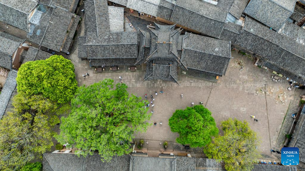 An aerial drone photo taken on April 19, 2025 shows a historical building that used to be a hostel at Sideng Village of Shaxi Town, Jianchuan County, southwest China's Yunnan Province. A remote town in Jianchuan County, Shaxi was once an important trading hub for tea, herbs, silks and salt on the ancient Tea Horse Road, a trade route dating back to the Tang Dynasty (618-907). (Xinhua/Hu Chao)