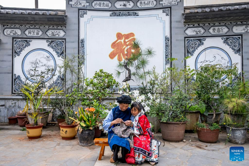 An elderly woman of Bai ethnic group makes embroidered sachets in Hualong Village of Shaxi Town, Jianchuan County, southwest China's Yunnan Province, April 20, 2025. A remote town in Jianchuan County, Shaxi was once an important trading hub for tea, herbs, silks and salt on the ancient Tea Horse Road, a trade route dating back to the Tang Dynasty (618-907). (Xinhua/Hu Chao)