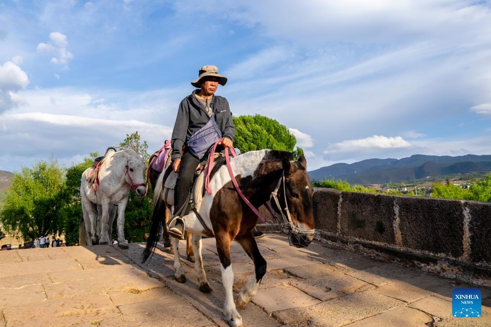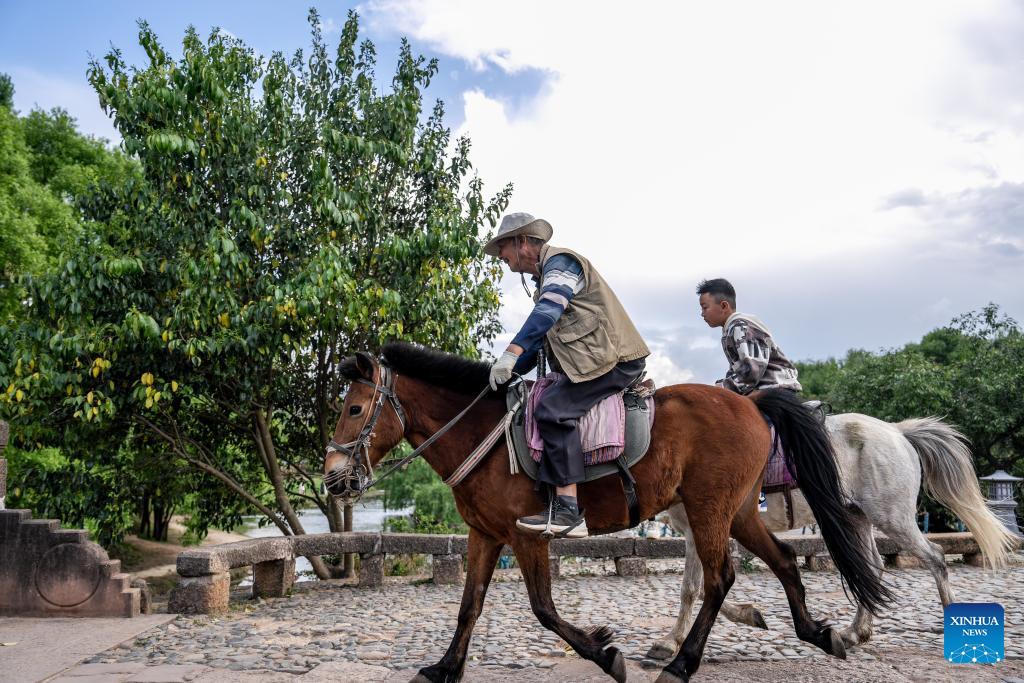 A villager crosses Yujin Bridge on horseback at Sideng Village of Shaxi Town, Jianchuan County, southwest China's Yunnan Province, April 18, 2025. A remote town in Jianchuan County, Shaxi was once an important trading hub for tea, herbs, silks and salt on the ancient Tea Horse Road, a trade route dating back to the Tang Dynasty (618-907). (Xinhua/Liu Lianfen)