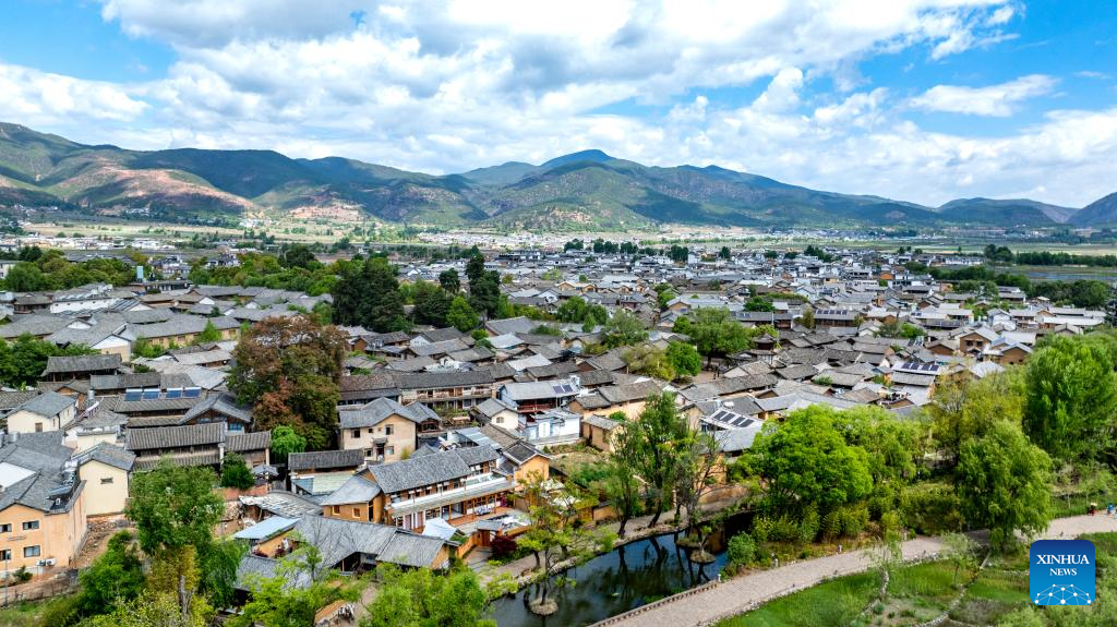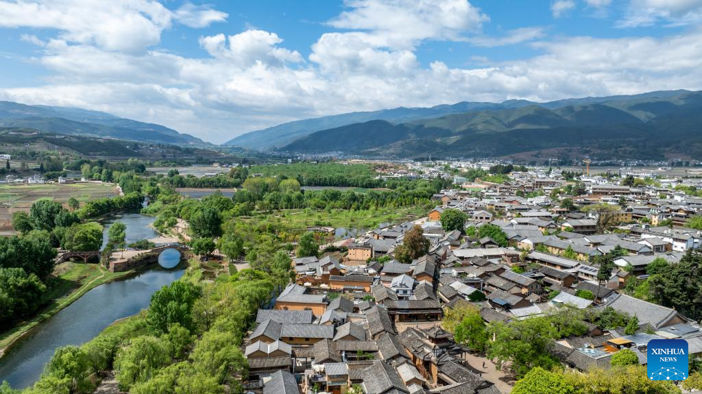 An aerial drone photo taken on April 21, 2025 shows the scenery of Sideng Village in Shaxi Town, Jianchuan County, southwest China's Yunnan Province. A remote town in Jianchuan County, Shaxi was once an important trading hub for tea, herbs, silks and salt on the ancient Tea Horse Road, a trade route dating back to the Tang Dynasty (618-907). (Xinhua/Hu Chao)